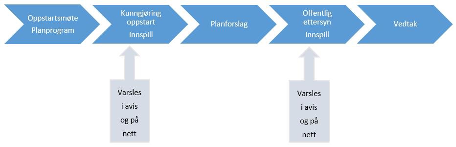 Enkel illustrasjon av påvirkningsmulighetene. Det åpnes for innspill ved oppstart av planarbeidet og for merknader til planforslaget når det legges ut på høring og offentlig ettersyn. Hvis det er større planer og tiltak blir det også ofte avholdt møter eller lagt opp til annen form for kommunikasjon.