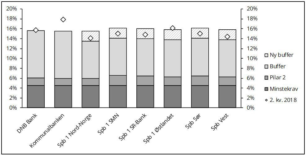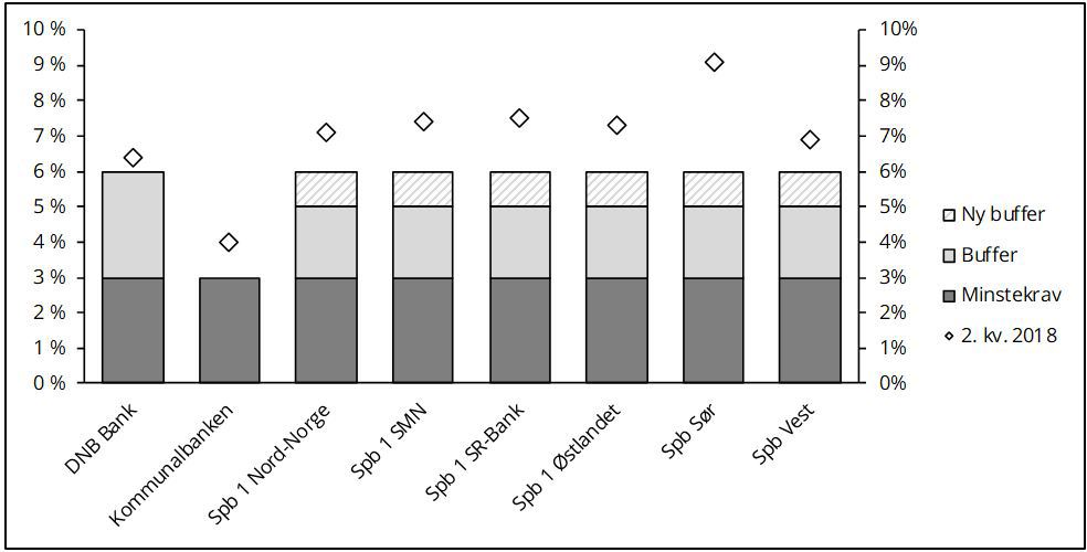 Finanstilsynets forslag kan for det første innebære at de identifiserte sparebankene får økt sitt bufferkrav til ren kjernekapitaldekning med 2 prosentpoeng. Med ett unntak lå sparebankene ved utgangen av 2. kvartal 2018 under de samlede minste- og bufferkravene til ren kjernekapitaldekning som kan følge av forslaget, se figur 1 under. I gjennomsnitt lå sparebankene om lag 1 prosentpoeng under. Behovet for årlig kapitaloppbygging vil avhenge av når en eventuell forskriftsendring trer i kraft. I perioden 2013-2016 økte norske banker sin rene kjernekapitaldekning med i gjennomsnitt 1,15 prosentpoeng per år. De samfunnsøkonomiske virkningene av kapitalkrav for banker er beskrevet bl.a. i avsnitt 6.3 i Nasjonalbudsjettet 2017.