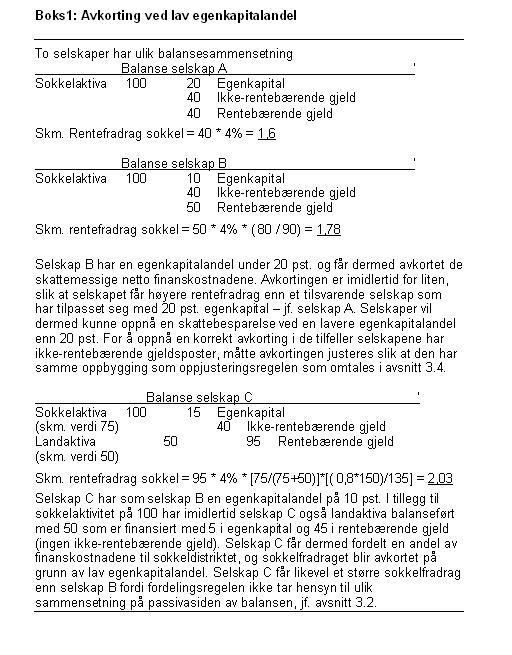 Med virkning fra inntektsåret 1994 ble det innført en begrensning i retten til skattefradrag for finansutgifter når regnskapsmessig egenkapitalandel er lavere enn 20 pst., jf. petroleumsskatteloven § 3 h. Dersom egenkapitalandelen i regnskapsmessig balanse pr. 31.12 er lavere enn 20 pst., skal det skje en forholdsmessig reduksjon (avkorting) av netto finansposter som kommer til fradrag på sokkelen ut fra følgende beregning: