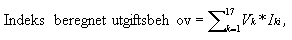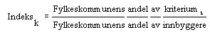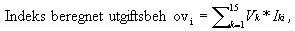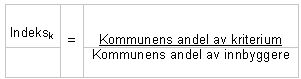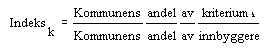 Indeks for beregnet utgiftsbehov beregnes som et vektet gjennomsnitt av indeksen for det enkelte kriterium etter følgende formel: