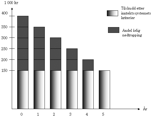 Fra og med 2003 får kommuner som mister regionaltilskuddet som følge av at befolkningstallet overstiger 3000 innbyggere, en gradvis nedtrapping av tilskuddet over 5 år. Kommuner som mister regionaltilskuddet som følge av at skatteinntektene overstiger 110 prosent av landsgjennomsnittet, vurderes i forbindelse med skjønnstildelingen.