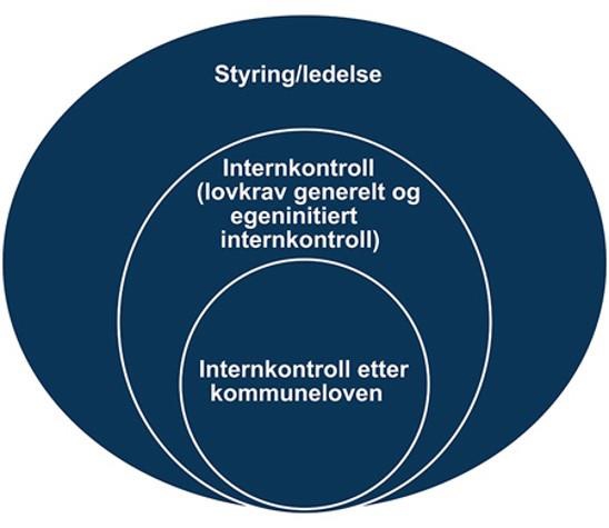 Figuren illustrer at internkontrollen er en del av kommunens styring/ledelse, men at styring/ledelse også er mye mer. Videre illustrerer figuren at internkontroll kan være noe mer enn internkontrollen etter kommuneloven. Det kan også være internkontroll etter andre lover, og det kan være internkontroll som kommunene velger å gjøre uten at det inngår i noen lovkrav.