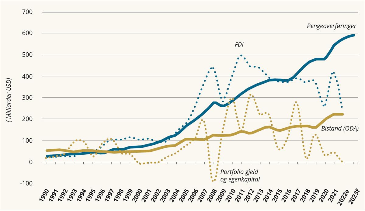 Bistand utgjør bare en del av de totale internasjonale finansstrømmene for bærekraftig utvikling i utviklingsland. Blant disse har særlig private pengeoverføringer fra diaspora blitt en stor kilde til ekstern finansiering. For utviklingsland under ett, lå nivået av både pengeoverføringer og utenlandske direkteinvesteringer (FDI) godt over ODA i totalt volum i 2021(se figur 3.3).56