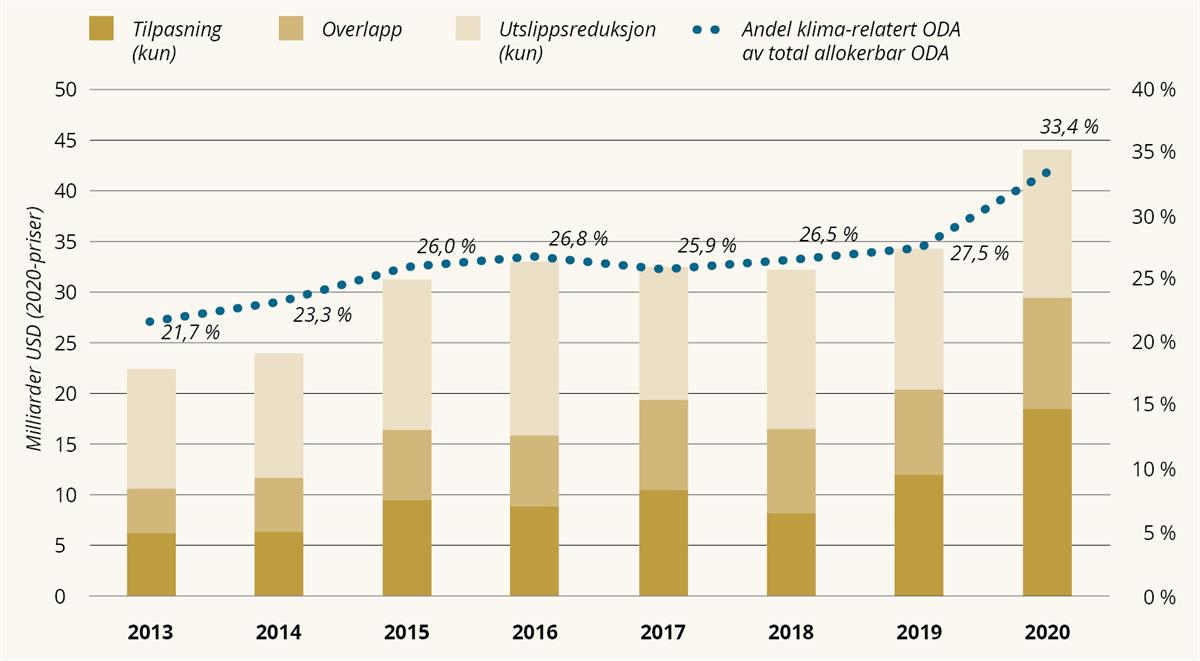 Note: Bistand fra medlemmer av OECDs utviklingskomité med utslippsreduksjon, klimatilpasning eller begge som et formål. Søylene viser avtalefestet beløp over signerte avtaler med et klimaformål det gjeldene året. Trendlinjen viser klimarelatert bistand som andel av total bilateral allokerbar ODA det gjeldende året. Bilateral allokerbar ODA = inkluderer all bistand unntatt kjernestøtte til multilaterale organisasjoner, generell budsjettstøtte, gjeldsslette, og utgifter i eget land som beregnet studentstøtte, informasjonsstøtte, flyktningutgifter og administrasjon, da disse per definisjon ikke kan markeres med klimamarkører.