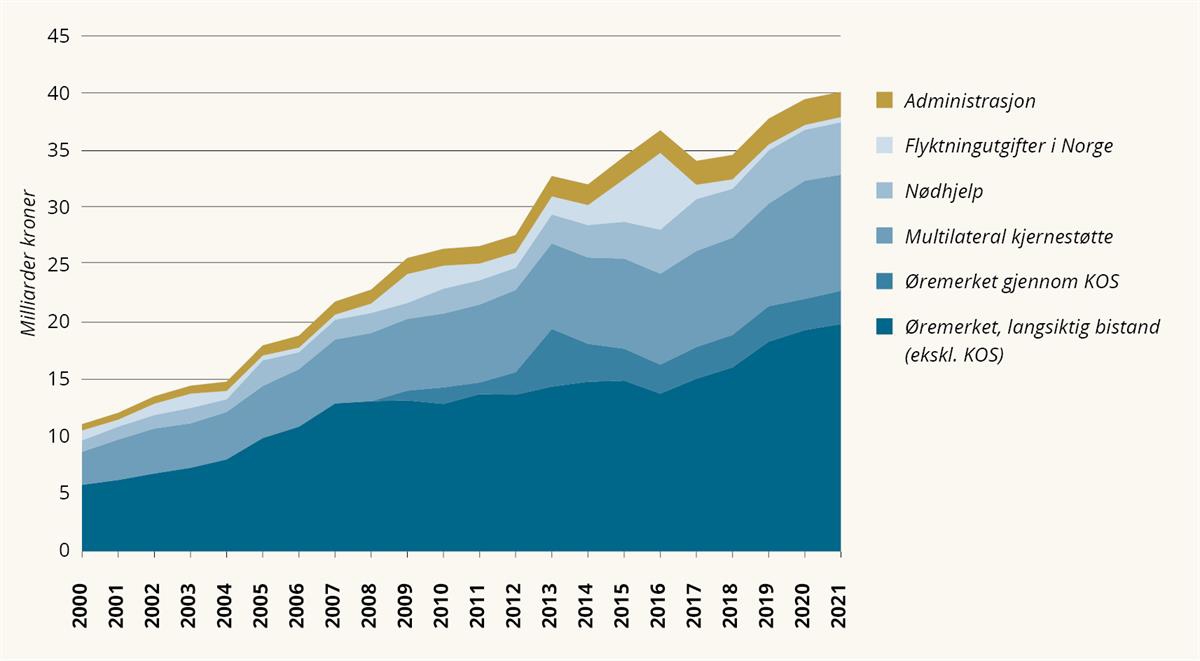 Norge er ett av fem medlemsland i OECDs utviklingskomité som når FN-målet om 0,7 prosent ODA av BNI.67 Norge har ligget over 0,7 prosent av BNI siden midten av 70-tallet, og har fra 2009 ligget på rundt én prosent av BNI. I 2022 var imidlertid andelen nede på 0,86 prosent. Fra år 2000 har kronebeløpet til norsk bistand økt i takt med økning i BNI, fra 11 til nesten 50 milliarder i 2022. Støtten til de fleste tematiske områdene har økt i takt med økninger i budsjettet, og nye prioriteringer har kommet til. Regjeringens klima- og skogsatsing markerer en klar ny tematisk prioritering fra 2009.68