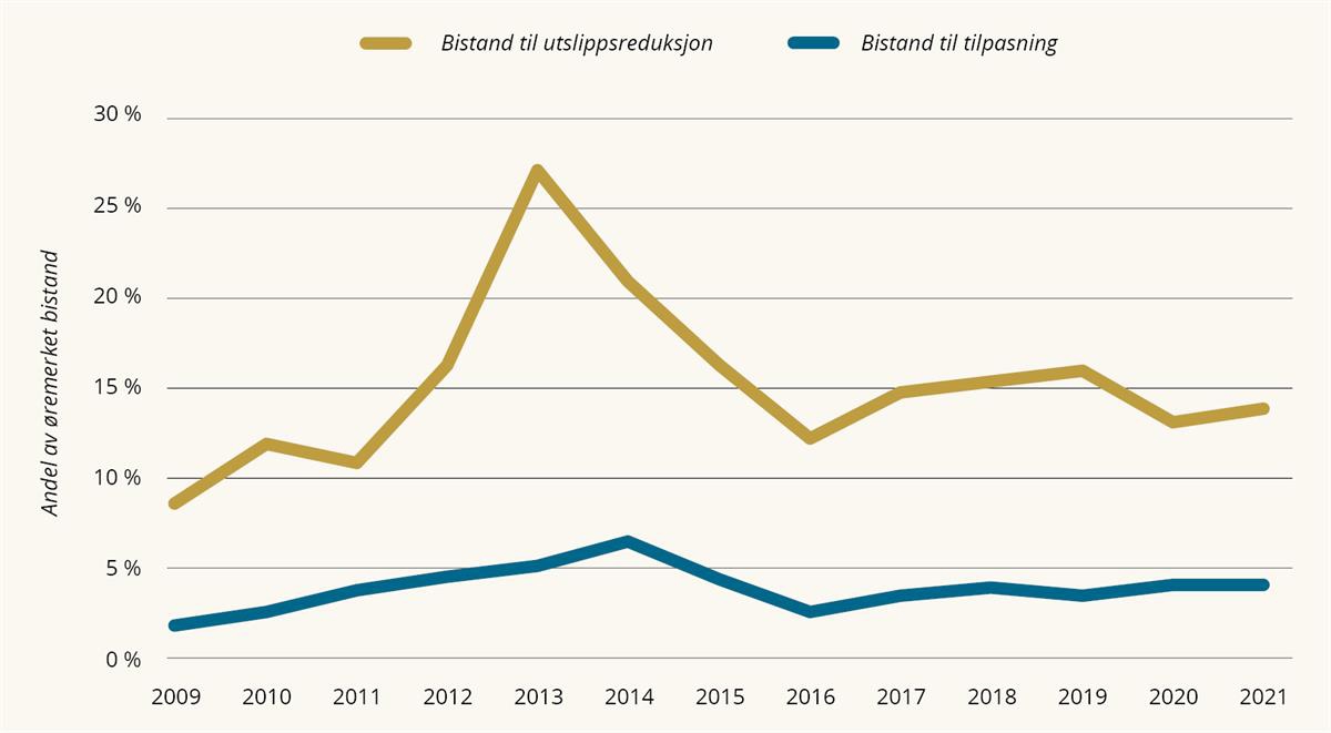 Note: Andel klimarelatert bistand av norsk øremerket bistand, ekskl. bistand gjennom Norfund. 100 % av utbetalt beløp over avtaler med utslippsreduksjon eller tilpasning som hovedmål er medregnet, samt 40 % av utbetalt beløp over avtaler med disse som delmål – i tråd med norsk metode. Øremerket bistand: All bistand unntatt administrasjon og kjernestøtte til multilaterale organisasjoner.