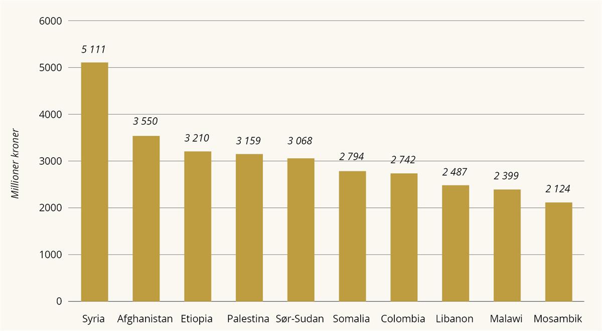 Fra 2016 til 2021 var Syria det landet som mottok mest bistand fra Norge. Syria er ikke et av regjeringens 17 prioriterte «partnerland i utviklingssamarbeidet».75 Dette viser igjen hvilken innvirkning konflikt og humanitære kriser har på innretningen av bistanden. Krigen i Ukraina endrer nå den geografiske innrettingen på norsk bistand fra 2022 og i flere år fremover. Ukraina er største mottakerland for norsk bistand, mens andelen av norsk bistand som går til land i Afrika og til minst utviklede land, går ned. Den samme utviklingen ser vi i de foreløpige tallene for internasjonal bistand.