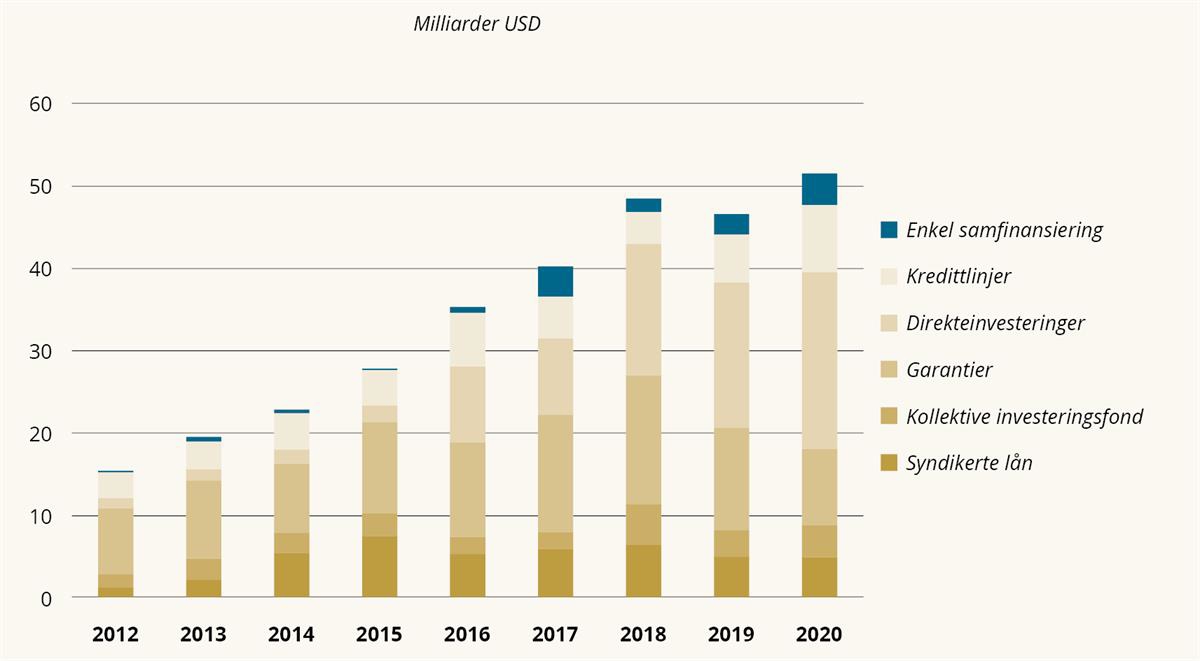 Det internasjonale giversamfunnet har hatt håp om at mer privat kapital skulle tilflyte utviklingsland og være en del av løsningen på finansieringsgapet, særlig innenfor klimafinansiering. Å bruke offentlige midler til å mobilisere private investeringer til utvikling, er en sentral del av finansieringsstrategien for å nå bærekraftsmålene og klimamålene. Det har vært en økning i mobilisert privat kapital, men økningen har stagnert og er lavere enn forutsatt. Ifølge OECDble det mobilisert knapt 50 milliarder USD årlig i perioden 2018 til 2020.48 Multilaterale utviklingsbanker er de største aktørene. De mobiliserte 69 prosent av totalen i 2020. Bilaterale aktører sto for 25 prosent gjennom sine institusjoner for utviklingsfinansiering.