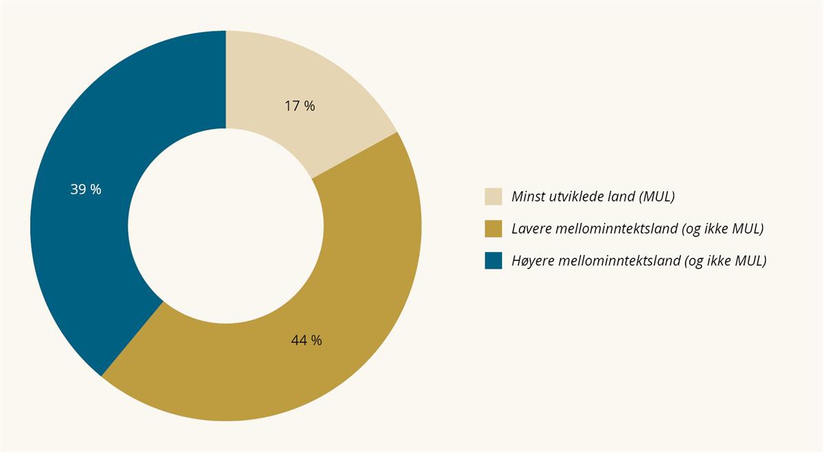 Note: Kakediagrammet er et gjennomsnitt for 2018-2020, og viser kun mobilisert privat finansiering som går til enkeltland. Minst utviklede land (MUL) består nå av 46 land som i hovedsak er lavinntektsland (26 av 28 lavinntektsland) og lavere mellominntektsland. I figuren er de to lavinntektslandene som ikke er MUL inkludert som MUL.