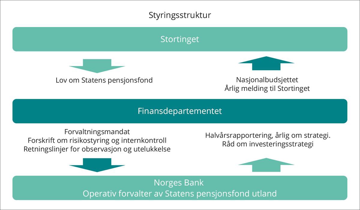 Stortinget har i lov om Statens pensjonsfond gitt Finansdepartementet ansvar for forvaltningen av fondet, mens departementet i mandat for forvaltningen av SPU har gitt Norges Bank ansvar for den operative gjennomføringen. Delegering av oppgaver og ansvar går nedover i styringskjeden, mens rapportering av resultater og risiko går oppover.