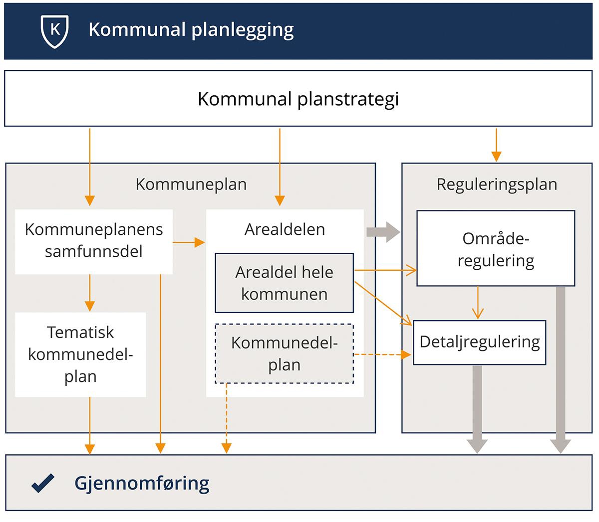 Figur 5.1 De formelle mulighetene loven gir for å gå fra kommuneplan til gjennomføring av tiltak.
