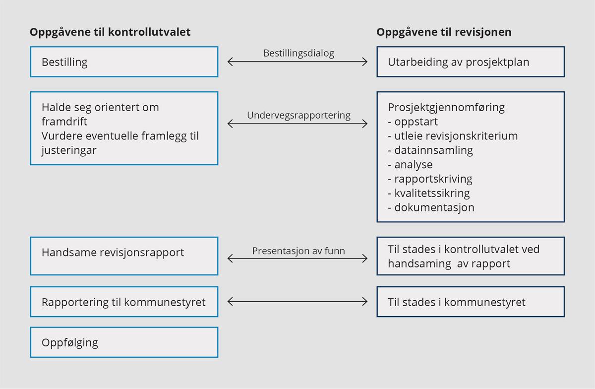 Revisor utfører forvaltningsrevisjonar på vegner av kontrollutvalet, og er ansvarleg for at gjennomføringa er i samsvar med regelverk og god kommunal revisjonsskikk. NKRF har utarbeidd ein norsk standard for gjennomføring av forvaltningsrevisjon, RSK 001, som er uttrykk for god kommunal revisjonsskikk i forvaltningsrevisjon. I revisjonsprosessen er det viktig med ein god dialog mellom kontrollutvalet og revisor. Figuren under viser kontrollutvalet og revisjonen sine respektive oppgåver i ein forvaltningsrevisjon.