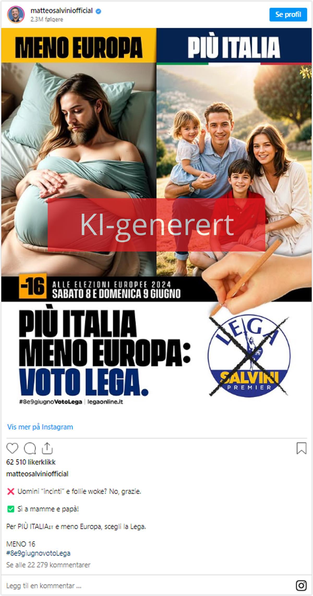I Italia benyttet Matteo Salvini, medlem av Europaparlamentet og leder av partiet Lega, generativ KI under årets Europaparlamentsvalg. Salvini er kjent for sin motstand mot EU-integrasjon. Bildene var ikke merket som KI-genererte, og dermed i strid med partiene i Europaparlamentet sin avtale om KI-bruk. Et av de KI-genererte bildene viste en gravid person med skjegg og teksten «mindre Europa», og på motsatt side en tilsynelatende heteronormativ familie med to barn og teksten «mer Italia». Bildet ble blant annet brukt i en Facebook-reklame, som antas å ha kostet mellom 4 500 og 5 000 euro med en rekkevidde på tre millioner brukere. Salvini publiserte også flere lignende bilder, blant annet ett som fremstilte den franske presidenten Emmanuel Macron i en militæruniform med et EU-flagg på skulderen. 94