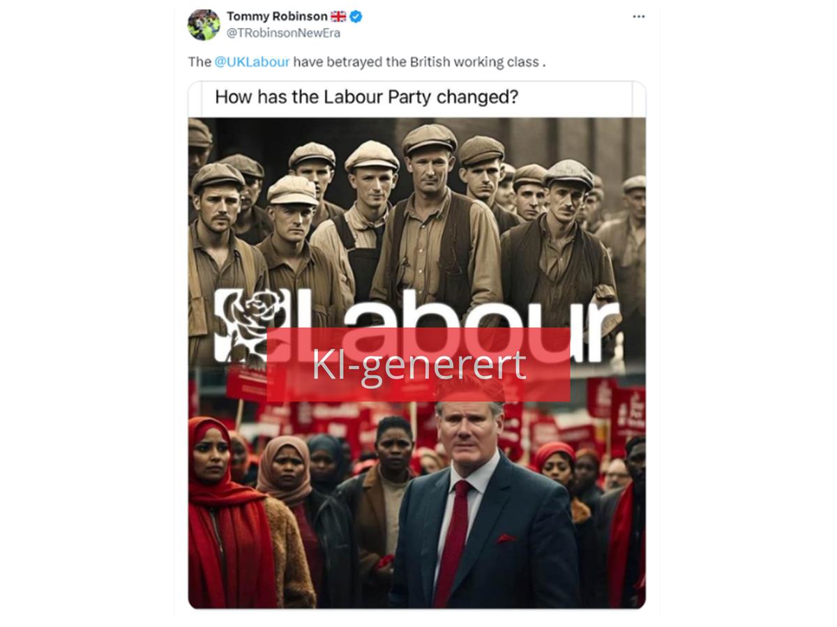 Ytre høyre-aktivisten Tommy Robinson delte et bilde på X for å diskreditere Keir Starmer og Labour, der han brukte et generert bilde som skulle illustrere at partiet ikke lenger sto på arbeidernes side. 101