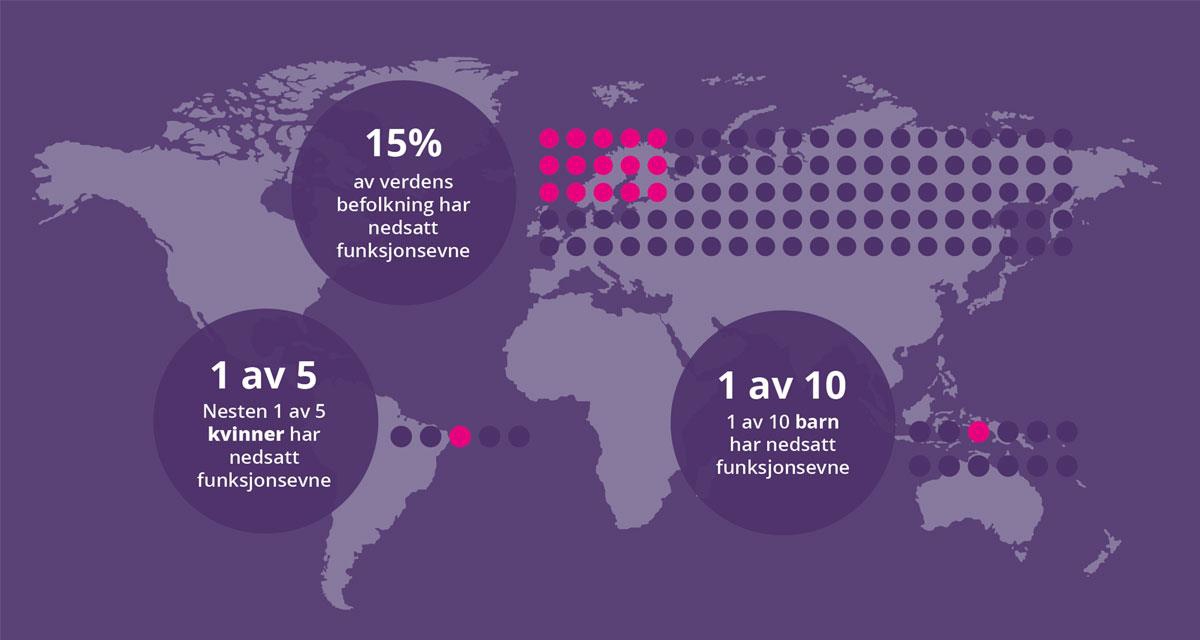 Om lag 15 prosent av verdens befolkning har nedsatt funksjonsevne.5 Det utgjør om lag 1,2 milliard mennesker. Globalt er det 240 millioner barn som har nedsatt funksjonsevne. Omtrent 18 prosent av personer i lavinntektsland har nedsatt funksjonsevne sammenlignet med om lag 12 prosent i høyinntektsland.7 I lav- og mellominntektsland havner mennesker med nedsatt funksjonsevne og deres familier nederst på nesten alle sosioøkonomiske utviklingsparametere.8 Dermed utgjør personer med nedsatt funksjonsevne en av de mest sårbare og marginaliserte gruppene i verden.