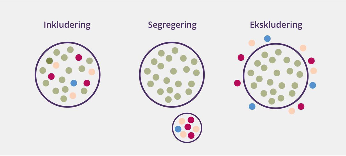 Figuren illustrerer hvordan inkludering kan sees som innlemmelse i felles arenaer til forskjell fra a) segregering med avskilte arenaer og tilbud og b) ekskludering hvor personer med nedsatt funksjonsevne utelates. 26