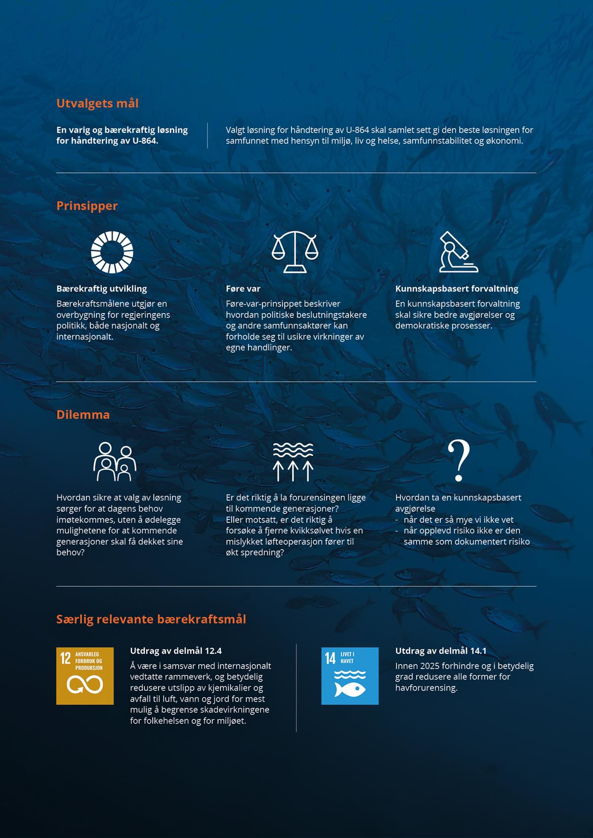 Siden Kystverkets utredninger i 2011 og 2014 har samfunnets fokus på bærekraft og bærekraftig utvikling økt betydelig. Forventninger til varig håndtering av forurensing i kretsløpet er endret. Agenda 2030 med FNs bærekraftsmål forventes i dag å ligge til grunn ved vurdering av miljøtiltak og samfunnsviktige tiltak. I tidligere utredninger av løsninger for U-864 har blant annet opplevd risiko i lokalmiljøet eksplisitt ikke vært en del av sluttvurderingen. Utvalget mener at opplevd trygghet og risiko i lokalmiljøet og eventuell usikkerhet for lokalt næringsliv er viktige aspekter i en helhetlig vurdering av hva som er en bærekraftig løsning.