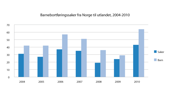 I 2010 ble det registrert 43 nye saker som berørte 64 barn. I de fleste barnebortføringssaker fra Norge til utlandet i perioden 2004-2010 ble barnet bortført til Sverige (18), deretter fulgte Storbritannia (15), USA (12), Danmark (10), Iran* (9), Irak* (9), Tyrkia (9), Brasil (8), Spania (8) og Filippinene* (7)24.