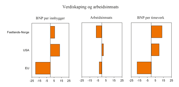Norge har et høyere inntektsnivå enn de aller fleste andre land. Medregnet petroleumsvirksomheten er BNP per innbygger om lag 20 pst. høyere enn i USA. Også hvis vi bare ser på fastlands-BNP ligger vi høyt. Figur 1.1 viser BNP per innbygger splittet opp i arbeidsinnsats per innbygger og BNP per timeverk. Det framgår at arbeidsinnsatsen er lavere i Norge enn i USA og EU. Vi får imidlertid mer igjen for hver arbeidet time. Avstanden til EU er særlig stor. Det er dels fordi vår produktivitet er høy, og dels fordi vi får gode priser på det vi selger til andre land.