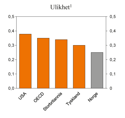 I Norge er inntektene jevnere fordelt enn i mange andre land, jf. figur 1.3. I tillegg går forskjellene i mindre grad i arv. Det må ses i sammenheng med relativt små lønnsforskjeller, høy sysselsetting og lav ledighet, samt skatte- og overføringssystemer som omfordeler inntekter. Like muligheter for innbyggerne fremmes ved betydelig offentlig satsing på bl.a. barnehager, skole og høyere utdanning. Gratis eller offentlig subsidierte tjenester bidrar også til å jevne ut konsummuligheter. Universelle ordninger for å sikre inntekter og et bredt tilbud av offentlige tjenester reduserer risiko ved sykdom, uførhet og tap av arbeid.