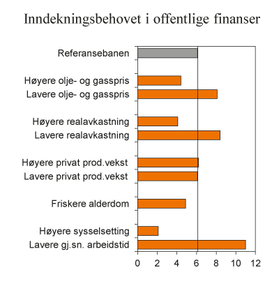 I denne meldingen er det gjort anslag for hva som skal til for å kunne videreføre dagens velferdsordninger de neste femti årene. Disse beregningene indikerer at en slik videreføring innebærer en betydelig økning i aldersrelaterte utgifter som ikke dekkes av vekst i skatteinntekter eller avkastning av pensjonsfondet. Behovet for inndekning stiger til om lag 6 pst. av verdiskapingen i fastlandsøkonomien fram mot 2060 dersom arbeidstilbudet ikke øker når levealderen øker. For å finansiere de økte utgiftene knyttet til aldringen må vi enten øke inntektene i offentlig sektor eller finne fram til innsparinger som ikke undergraver de viktigste velferdsordningene.