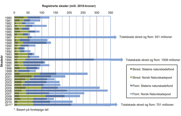 Statistiske data for naturskader er registrert hos Norsk Naturskadepool og Statens naturskadefond. Norsk Naturskadepool har i årene 1980–2010 registrert 30 000 erstatningssaker knyttet til flom. Til sammen har Norsk Naturskadepool og Statens naturskadefond i denne perioden registrert skader knyttet til flom for 4,7 mrd. kroner (justert til 2010-kroner). Foreløpige tall viser at det i 2011 ble registrert flomskader for over 600 mill. kroner. De sentrale østlandsområdene dominerer skadestatistikken for flom ettersom det her er store vassdrag og hvor områdene rundt er relativt tett bebygd. Figur 3.4 viser hvordan forsikringsskadene på flom og skred har fordelt seg per år fra 1980 til og med 2011.