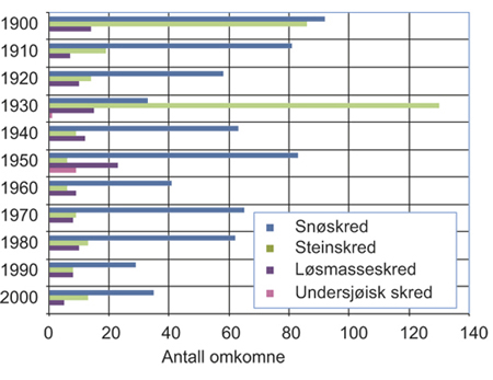 Historikk om skredhendelser i Norge er samlet i en nasjonal database og presentert på skrednett.no. Totalt er rundt 30 000 hendelser registrert siden år 1900. Ved 500 av disse hendelsene er det registrert tap av liv, til sammen rundt 1100 omkomne. Figur 3.5 viser en oversikt over antall omkomne i skred i Norge per tiår siden 1900 fordelt på skredtyper.