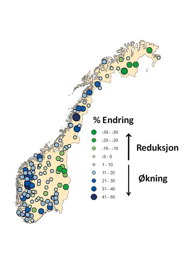NVE har gjort en nærmere analyse av hvordan flommønsteret vil endre seg som følge av klimaendringer.1 På grunn av nedbørfeltets lagringsegenskaper og endringer i snøakkumulering og snøsmelting er det ingen enkel én til én relasjon mellom endringer i nedbør og endringer i flom. For å vurdere virkningen av de forventede endringene i nedbør og temperatur på flom er det benyttet hydrologiske modeller med nedskalerte klimafremskrivninger som inngangsdata. Basert på ulike scenarioer for klimagassutslipp, ulike klimamodeller, ulik nedskaleringsmetodikk og ulike hydrologiske modelloppsett vil en få ulike fremskrivninger for flom. Figur 3.7 viser endring i 200-årsflommen mellom referanseperioden 1961–90 og framskrivning for perioden 2021–2050. Grønt indikerer forventede reduserte og blått forventede økte flomstørrelser.