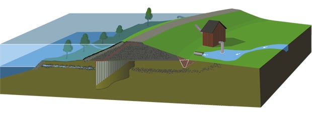 Figur 8.1 Prinsippskisse, oppbygging av flomvoll for å hindre oversvømmelser.