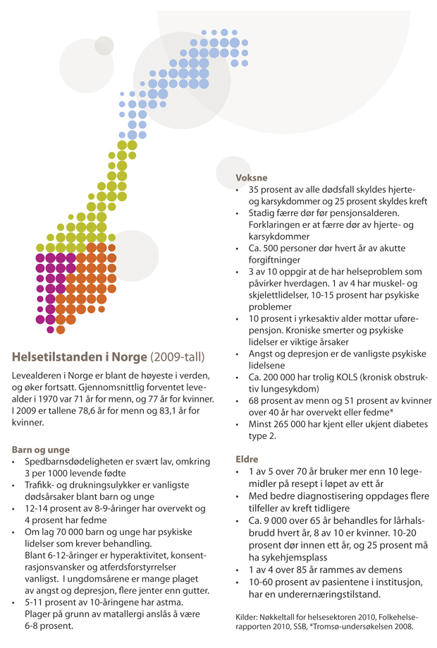 Befolkningen i Norge har generelt god helse. I løpet av det 20. århundret økte forventet levealder ved fødsel med 24 år. Tidlig i forrige århundre ble levealdergevinsten først og fremst realisert før pensjonsalder. I dag er situasjonen omvendt. For noen tiår siden førte økningen i levealder til en økning av antall nordmenn i arbeidsfør alder. Nå fører økningen til flere pensjonister.