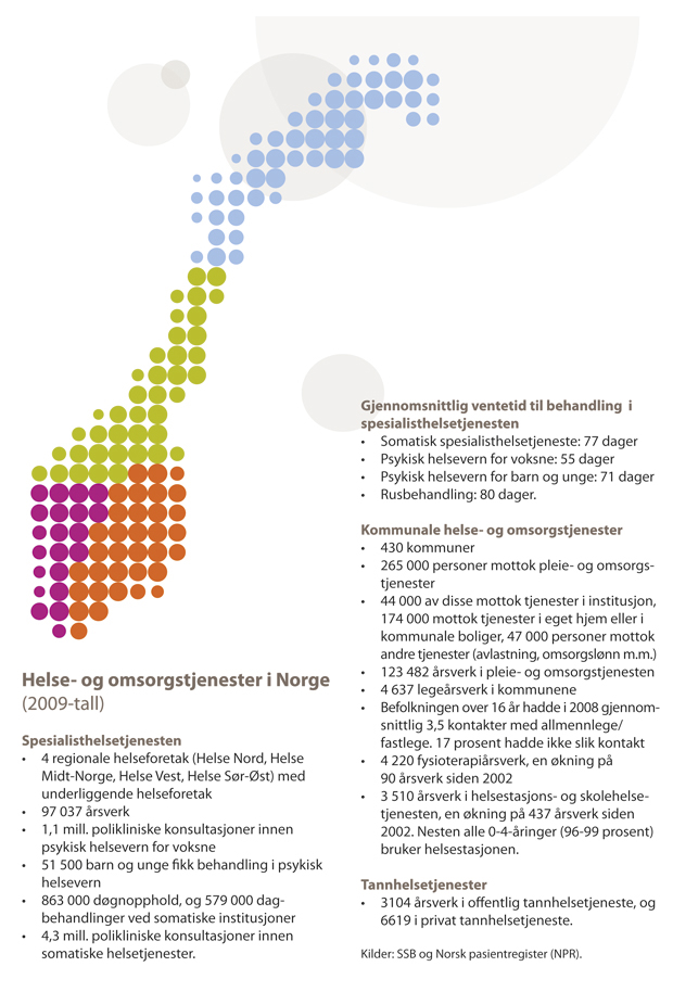 Helse- og omsorgstjenesten i Norge har utviklet seg til en omfattende og komplisert virksomhet med økende krav til personell, kompetanse, bygninger og utstyr. Kunnskapen om helsefremmende faktorer og sykdomsårsaker øker. Nye behandlings- og omsorgstilbud skaper nye behov, og veksten i sektoren har vært betydelig. Befolkningens helse påvirkes av forhold som ligger utenfor helsesektoren. Samtidig er en velfungerende helsetjeneste en viktig forutsetning for god helse.