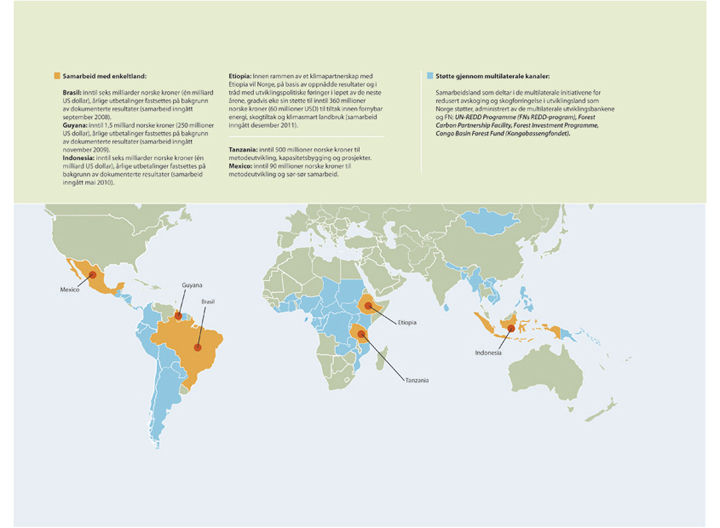 Ifølge tall fra World Resource Institute (2005) sto Brasil og Indonesia i 2005 for over halvparten av verdens utslipp fra avskoging. Norge har inngått intensjonsavtaler på inntil 6 milliarder norske kroner til hvert av disse landene som betaling for faktiske resultater, primært i form av verifiserte utslippsreduksjoner. Å redusere utslippene fra skogsødeleggelser her vil ha en stor effekt på verdens klima. Hvis man for eksempel klarer å halvere avskogingen i bare disse to landene fra 2005-nivå, tilsvarer det 4 prosent reduksjon av verdens totale utslipp av CO2. Dette tilsvarer 1,3 milliarder tonn CO2-ekvivalenter – litt mer enn de totale CO2-utslippene til Japan, som var verdens syvende største utslippsland i 2005.