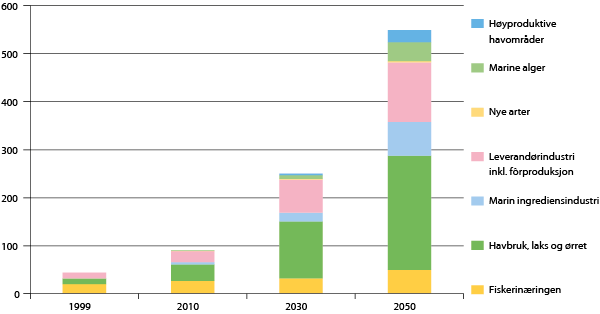 Rapporten fra Det Kongelige Norske Videnskabers Selskab (DKNVS) og Norges Tekniske Vitenskapsakademi (NTVA), «Verdiskaping basert på produktive hav i 2050» (2012), peker på utviklingstrekk og et økonomisk omsetningspotensial i de marine næringene som estimeres til 550 milliarder kroner i 2050 mot dagens ca. 90 milliarder kroner.