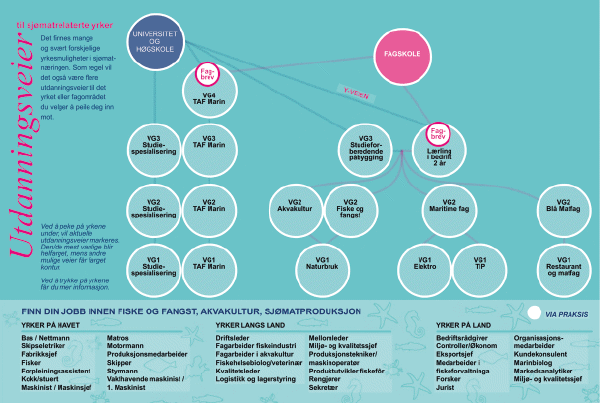 Til sammen tilbys det marine og maritime fag på 30 videregående skoler langs kysten fra Nordkapp til Etterstad i Oslo. For marin sektor er naturbruk, fiske/fangst og akvakultur, samt restaurant og matfag og maritime linjer de største yrkesutdanningene på videregående nivå.