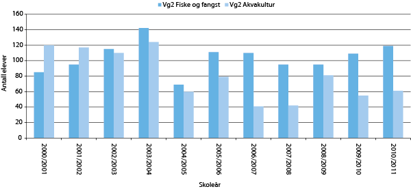 Figuren viser at antall søkere til disse linjene varierer en del fra år til år med en nedgang i 2004/2005. Det har vært en svak økning for akvakultur de siste tre årene. Andelen jenter er lav, med henholdsvis fem prosent i fiske og fangst og 25 prosent i akvakultur i 2012. Andelen jenter som tar akvakulturutdanning har imidlertid vært økende de siste årene.