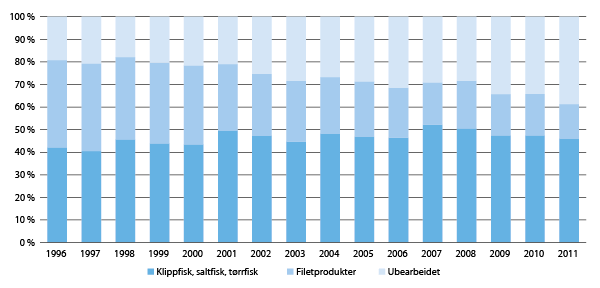 Konvensjonell sektor har økt sin andel av produksjonen, og klippfisk er nå det viktigste hvitfiskproduktet målt i eksportverdi. Det har også vært en kraftig økning i eksporten av fryst ubearbeidet hvitfisk. Figur 9.3 viser utviklingen i bearbeiding av torsk, hyse og sei de siste 16 årene.