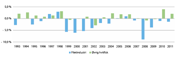Hvitfiskindustrien har gått gjennom kontinuerlig rasjonalisering og omstrukturering, hvor antall filetbedrifter har blitt kraftig redusert. Den negative utviklingen har imidlertid stanset opp, og hvitfiskindustrien opplevde noe økt aktivitet og sysselsetting både i 2011 og 2012. Økte kvoter på torsk og bedre lønnsomhet bidro til den positive utviklingen. Flere filetbedrifter sliter imidlertid fortsatt med lav lønnsomhet.
