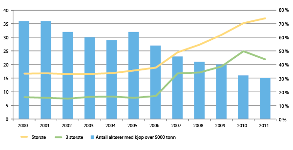 Figur 9.5 viser utviklingen i antall foredlingsbedrifter av en viss størrelse, og andelen av pelagisk råstoff som kjøpes av henholdsvis den største og de tre største bedriftene.