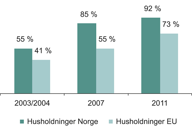 Ifølge Statistisk sentralbyrå har 93 prosent av norske husholdninger tilgang3 til internett i hjemmet.4 I 2003 var tilsvarende tall 55 prosent. For EU samlet (27 land) har 73 prosent av husholdningene tilgang til internett i hjemmet (2011). Tilsvarende tall var 41 prosent i 2004.