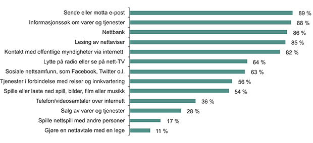 E-post og informasjonssøk om varer og tjenester er det vi bruker mest. Ni av ti gjør dette. Nesten like mange leser nettaviser, og stadig flere bruker også nettet til å høre på radio eller se på TV.5 63 prosent har brukt sosiale nettsamfunn. Her er det stor spredning blant aldersgruppene: Ni av ti personer under 35 år har brukt nettsamfunn, mens bare 20 prosent av de mellom 65 og 74 år har gjort det samme.6