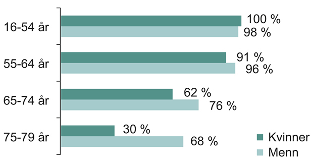Alder er den viktigste forklaringsfaktoren for digital deltakelse. For de mellom 16 og 54 år har omtrent alle, 99 prosent, brukt internett de siste tre månedene. For «60-åringene» (55–64 år) er andelen også veldig høy og ligger på 93 prosent. For «70-åringene» (65–74 år) har 69 prosent vært på nett. Det er altså et klart flertall av 70-åringene, men langt fra alle. Det er først i gruppen over 75 år (75–79) at nettbrukerne er i mindretall. I denne gruppen er andelen 47 prosent. I tillegg har vi gruppen eldre over 79 år, som ikke fanges opp av den offisielle statistikken. Her er også internettbrukerne i mindretall.