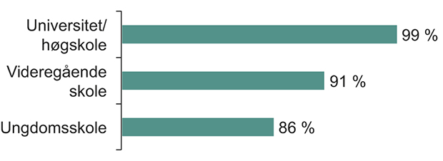 Utdanningsnivå og nettbruk henger sammen. Av de med høyere utdanning har 99 prosent vært på nettet nylig. For de som kun har ungdomsskoleutdanning, er andelen noe lavere, 86 prosent.