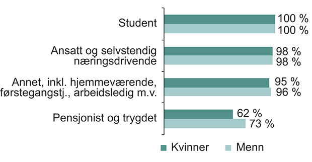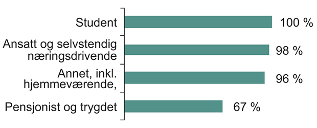 Nær sagt alle som er i arbeid eller studerer, har vært på internett de siste tre månedene. Andelen er henholdsvis 98 og 100 prosent. Pensjonister og trygdede bruker internett langt mindre hyppig.