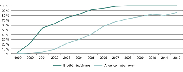 Staten har siden 2006 bidratt med over én milliard kroner til bredbåndsutbygging i områder uten et kommersielt bredbåndstilbud. Av dette er 370 millioner kroner bevilget over budsjettet til Fornyings-, administrasjons- og kirkedepartementet og 756 millioner kroner til fylkeskommunene over budsjettet til Kommunal- og regionaldepartementet. Midlene har trolig bidratt til at det er blitt bygget om lag 100 000 nye bredbåndsaksesser. For 2012 ble det tildelt 123 millioner kroner til fylkeskommuner og kommuner innenfor det distriktspolitiske virkeområdet. Fylkeskommunene mottar dessuten andre regionale utviklingsmidler som også kan brukes til bredbånd. Regjeringen har foreslått at ordningen med øremerkede bredbåndsmidler over budsjettet til Kommunal- og regionaldepartementet skal fortsette også i 2013.