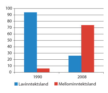 Kilde: Andy Sumner, Where do the Poor People Live: An Update (basert på tall fra Verdensbanken)
