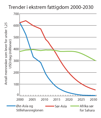 Figur 1.3 Reell og forventet utvikling i antall mennesker som lever for mindre enn USD 1,25 pr dag.