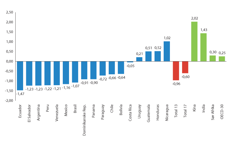 Figur 2.4 Gjennomsnittlig årlig prosentvis endring i Gini-koeffisienten i Latin-Amerika sammenliknet med et utvalg andre land, 2000-2010. Negative tall betyr redusert ulikhet.