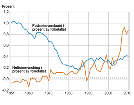 Figur 1.2 Fødselsoverskudd og innvandring i prosent, 1951–2010.