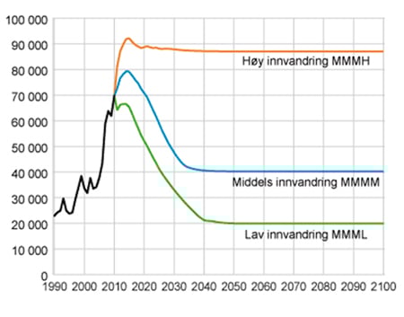 Figur 1.3 Innvandring: registrert og framskrevet i tre alternativer.