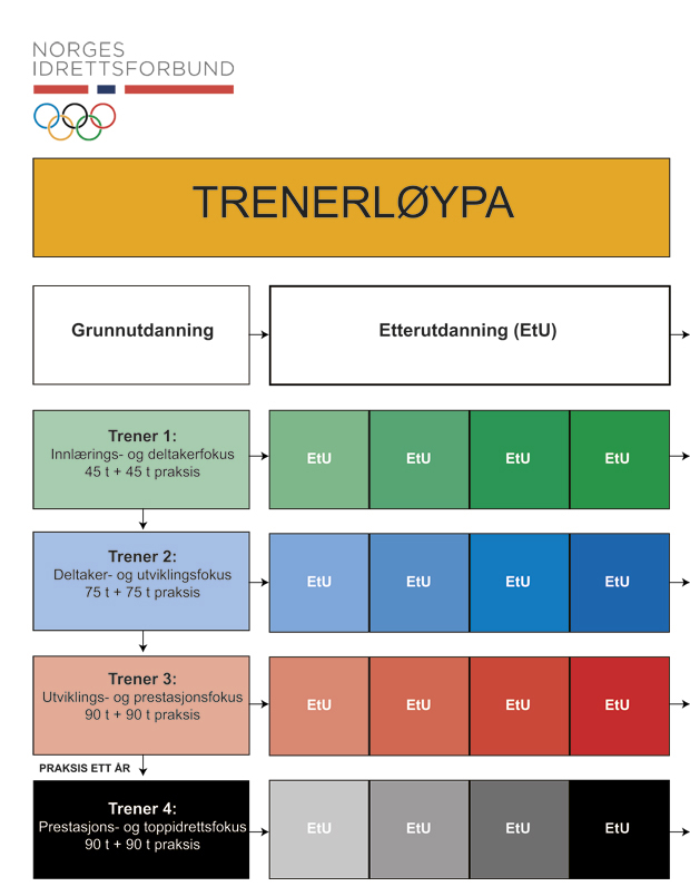 I samarbeid med særforbundene har NIF utviklet en ny trenerutdanning (trenerløypa). Et av elementene er økt satsing på og skolering av trenere som skal legge til rette for lavterskel og breddeaktiviteter. Trenerløypa er i stor grad begrunnet med behovet for økt kompetanse for å ivareta behovene til ungdommer som ønsker et idrettstilbud, men ikke nødvendigvis ønsker å satse for å bli best mulig innenfor tradisjonell konkurranseidrett.